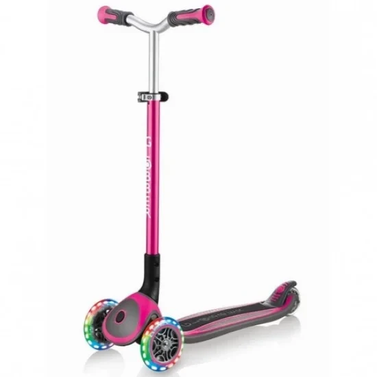 Трёхколёсный премиум класса самокат Globber ELITE MASTER LIGHTS розовый станет прекрасным сюрпризом для детей от 4 лет. Они оснащены яркими светящимися колёсами, усиленной очень широкой декой с нескользящей прорезиненной поверхностью, которая подарят малышам множество новых впечатлений, они так же имеют широкий диапазон регулировки высоты руля 5 уровней, что позволяет использовать его с 4 до 14 лет. Идеальный вариант, обеспечивающий простоту хранения и транспортировки за счёт наличия революционной системы складывания при помощи одного нажатия на кнопку.