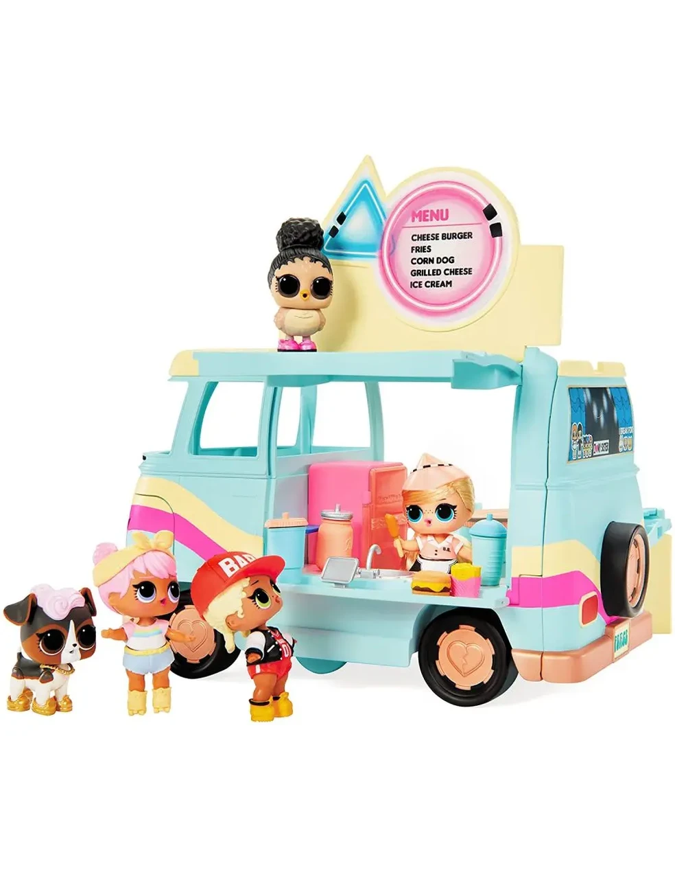 Этот игровой набор 5-в-1 может трансформироваться в автофургон, машину, кухню, сцену и зону отдыха. Разверните множество сюрпризов, в том числе напитки, игрушечную еду, вращающийся танцпол, флаги, кассовый аппарат, лист с наклейками и многое другое! Чтобы трансформировать кемпер, сначала сдвиньте заднюю дверь вниз, затем поднимите крышу и откройте меню. Теперь откройте обе двери, чтобы открыть окно для еды на вынос, и приготовьтесь к грилю. Куклы могут начать свою вечеринку, соскользнув со сцены фургона и поставив стол и стулья снаружи для отличного вечера. Все ваши любимые куклы и животные LOL Surprise поместятся в кемпере 5-в-1.